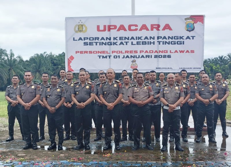 PADANG LAWAS – Polres Padang Lawas melaksanakan upacara kenaikan pangkat personil periode TMT- (01/01/2026) pada Jumat, (02/01/2026), pukul 09.00 Wib sampai dengan selesai. Kegiatan berlangsung di halaman Mapolres Padang Lawas. Sebanyak 27 personil Polres Padang Lawas memperoleh kenaikan pangkat setingkat lebih tinggi,