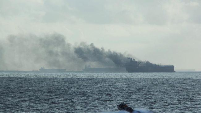 Foto: Perahu karet RSS Supreme dengan lambung kaku di sekitar kapal yang terbakar menyusul kebakaran di dua kapal tanker minyak sekitar 55 km (34 mil) timur laut pulau Pedra Branca di Singapura, 19 Juli 2024. (via REUTERS/Republic of Singapore Navy)