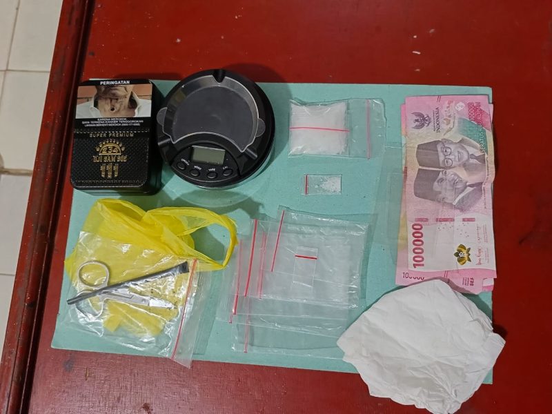 Barang bukti yang di temukan yaitu 1 paket sedang narkotika jenis shabu, 1 paket kecil di duga narkotika jenis shabu, 1 unit timbangan digital, 1 buah kotak rokok, 7 lembar plastik klip, 2 lembar plastik bening, 1 lembar plastik kresek , 2 lembar tisu, 1 buah sendok shabu yang terbuat dari pipet, 1 buah gunting, 1 unit handphone, uang Rp. 300.000,-.