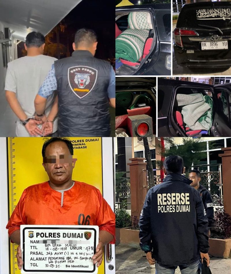 DUMAI – Jajaran Polres Dumai berhasil mengungkap kasus pencurian dengan pemberatan yang menyasar rumah ibadah di wilayah Kota Dumai. Tersangka, Malik Asip Ali (47), warga Rokan Hilir, diringkus setelah terbukti melakukan serangkaian aksi pencurian karpet dan sajadah di sejumlah masjid dan musala.