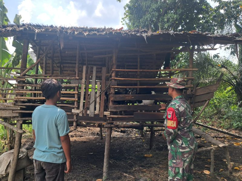 BENGKALIS — Dalam rangka mencegah penyebaran Penyakit Mulut dan Kuku (PMK) pada hewan ternak, Sertu Jainuri bersama Bapak Ridwan selaku pemilik ternak, melaksanakan kegiatan pemantauan kondisi kesehatan hewan di Desa Hutan Panjang, Kecamatan Rupat, Kabupaten Bengkalis.
