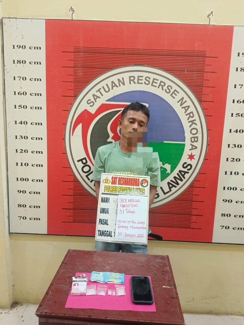 PADANG LAWAS – Tim Opsnal Satresnarkoba Polres Padang Lawas kembali mengungkap kasus tindak pidana narkotika. Seorang pria berinisial DMS, (31), bekerja sebagai Petani, warga Desa mondang, Kecamatan Sosa, Kabupaten Padang Lawas berhasil diamankan petugas karena diduga terlibat penyalahgunaan narkotika jenis sabu.