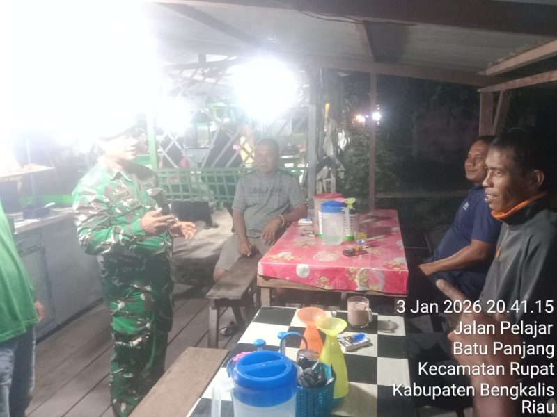 BENGKALIS – Dalam rangka menjaga keamanan dan ketertiban masyarakat, TNI bersama Ketua RT/RW, anggota Linmas, serta pemuda setempat melaksanakan patroli mitigasi Sistem Keamanan Lingkungan (Siskamling) di wilayah Koramil 04/Rupat, Kelurahan Batu Panjang, Kecamatan Rupat, Kabupaten Bengkalis.