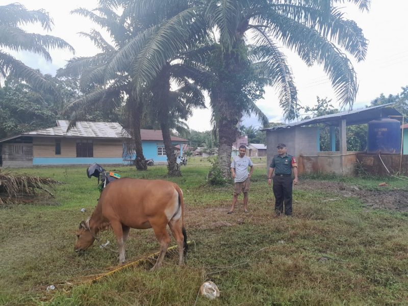BENGKALIS – Babinsa 04/Rupat Praka Tarigan bersama Firman selaku pemilik ternak melaksanakan kegiatan pemantauan Penyakit Mulut dan Kuku (PMK) pada hewan ternak bertempat di Desa Teluk Lecah, Kecamatan Rupat, Kabupaten Bengkalis. Senin (02/02/2026) sampai dengan selesai.