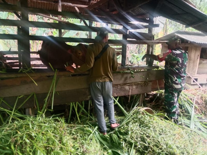 BENGKALIS – Babinsa Koramil 04/Rupat, Serda Wondo, bersama pemilik ternak Bapak Rahmat melaksanakan kegiatan pemantauan Penyakit Mulut dan Kuku (PMK) pada hewan ternak di wilayah Pancur Jaya, Kecamatan Rupat, Kabupaten Bengkalis.