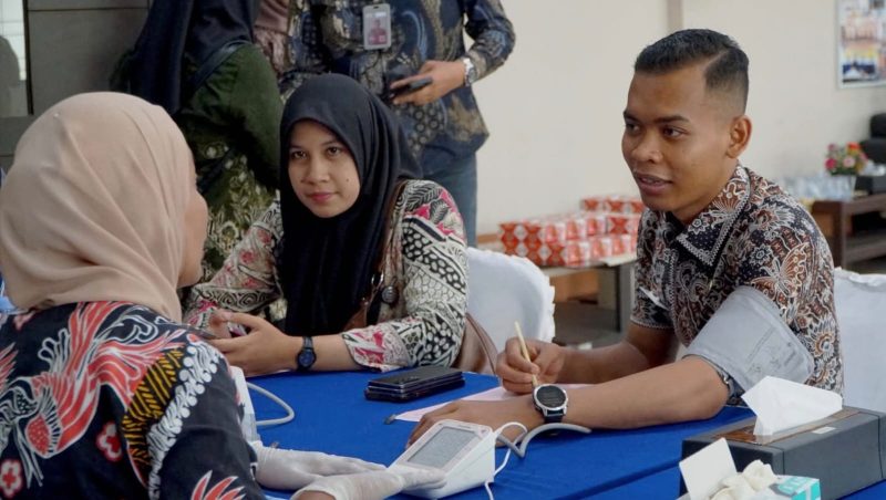 Para peserta mendapatkan layanan pemeriksaan kesehatan meliputi pengecekan tekanan darah, gula darah, dan kolesterol, serta konsultasi kesehatan oleh tenaga medis.