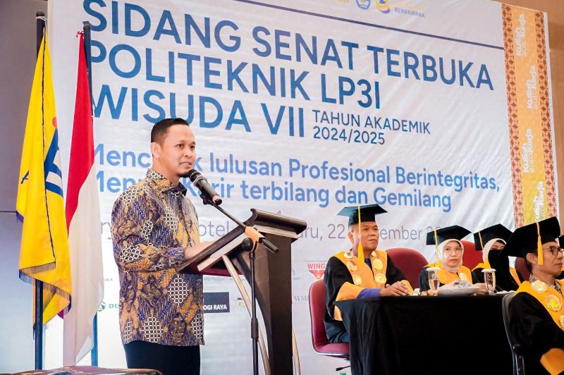 PEKANBARU – Walikota Pekanbaru H Agung Nugroho SE MM, menghadiri Sidang Senat Terbuka Politeknik LP3I Wisuda VII tahun akademik 2024-2025, Sabtu (22/11/2025).